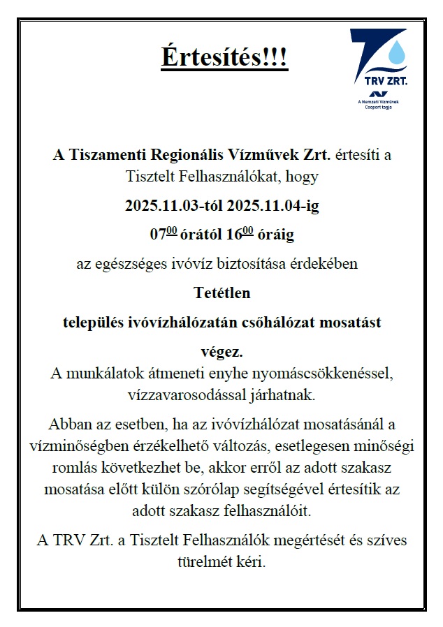 Mosatási értesítő Tetétlen 2025. 11 hónap